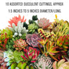 20 Assorted Succulent Cuttings - You will receive at least 10 assorted various succulent cuttings, approx 1.5 inches to 5 inches diameter/long. We do our best effort to include as much mix of colors base on the current availability but you will not necessary receive the cuttings shown in the picture for this listing